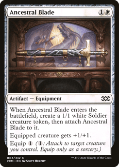 When this Equipment enters, create a 1/1 white Soldier creature token, then attach this Equipment to it. Equipped creature gets +1/+1. Equip {1} ({1}: Attach to target creature you control. Equip only as a sorcery.)