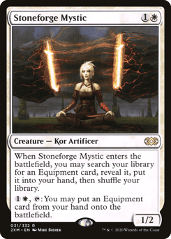 When this creature enters, you may search your library for an Equipment card, reveal it, put it into your hand, then shuffle. {1}{W}, {T}: You may put an Equipment card from your hand onto the battlefield.