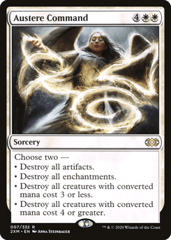 Choose two — • Destroy all artifacts. • Destroy all enchantments. • Destroy all creatures with mana value 3 or less. • Destroy all creatures with mana value 4 or greater.