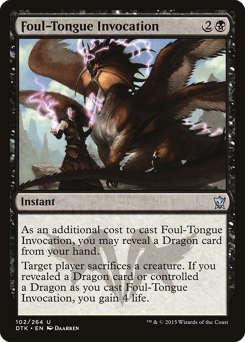 As an additional cost to cast this spell, you may reveal a Dragon card from your hand. Target player sacrifices a creature of their choice. If you revealed a Dragon card or controlled a Dragon as you cast this spell, you gain 4 life.
