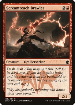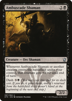 Whenever this creature or another creature you control enters, that creature gets +2/+2 until end of turn. Dash {3}{B} (You may cast this spell for its dash cost. If you do, it gains haste, and it's returned from the battlefield to its owner's hand at the beginning of the next end step.)