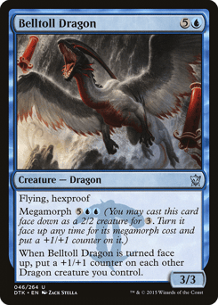 Flying, hexproof Megamorph {5}{U}{U} (You may cast this card face down as a 2/2 creature for {3}. Turn it face up any time for its megamorph cost and put a +1/+1 counter on it.) When this creature is turned face up, put a +1/+1 counter on each other Dragon creature you control.