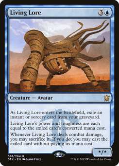As this creature enters, exile an instant or sorcery card from your graveyard. Living Lore's power and toughness are each equal to the exiled card's mana value. Whenever this creature deals combat damage, you may sacrifice it. If you do, you may cast the exiled card without paying its mana cost.