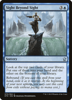 Look at the top two cards of your library. Put one of them into your hand and the other on the bottom of your library. Rebound (If you cast this spell from your hand, exile it as it resolves. At the beginning of your next upkeep, you may cast this card from exile without paying its mana cost.)
