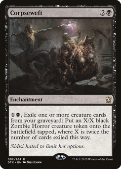 {1}{B}, Exile one or more creature cards from your graveyard: Create a tapped X/X black Zombie Horror creature token, where X is twice the number of cards exiled this way.