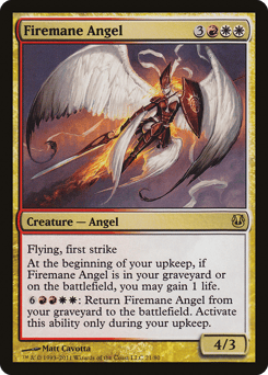 Flying, first strike At the beginning of your upkeep, if Firemane Angel is in your graveyard or on the battlefield, you may gain 1 life. {6}{R}{R}{W}{W}: Return this card from your graveyard to the battlefield. Activate only during your upkeep.