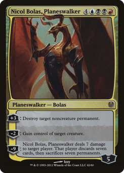 [+3]: Destroy target noncreature permanent. [−2]: Gain control of target creature. [−9]: Nicol Bolas deals 7 damage to target player or planeswalker. That player or that planeswalker's controller discards seven cards, then sacrifices seven permanents of their choice.