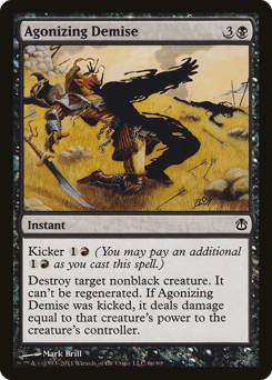 Kicker {1}{R} (You may pay an additional {1}{R} as you cast this spell.) Destroy target nonblack creature. It can't be regenerated. If this spell was kicked, Agonizing Demise deals damage equal to that creature's power to the creature's controller.