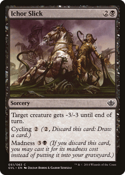 Target creature gets -3/-3 until end of turn. Cycling {2} ({2}, Discard this card: Draw a card.) Madness {3}{B} (If you discard this card, discard it into exile. When you do, cast it for its madness cost or put it into your graveyard.)