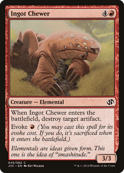 When this creature enters, destroy target artifact. Evoke {R} (You may cast this spell for its evoke cost. If you do, it's sacrificed when it enters.)