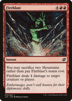 You may sacrifice two Mountains rather than pay this spell's mana cost. Fireblast deals 4 damage to any target.