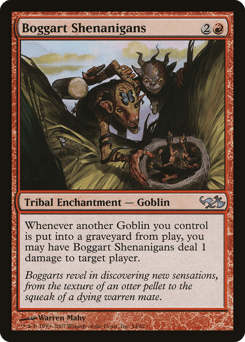 Whenever another Goblin you control is put into a graveyard from the battlefield, you may have this enchantment deal 1 damage to target player or planeswalker.
