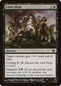 Target creature gets -3/-3 until end of turn. Cycling {2} ({2}, Discard this card: Draw a card.) Madness {3}{B} (If you discard this card, discard it into exile. When you do, cast it for its madness cost or put it into your graveyard.)