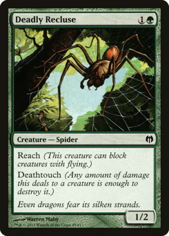 Reach (This creature can block creatures with flying.) Deathtouch (Any amount of damage this deals to a creature is enough to destroy it.)