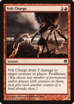 Volt Charge deals 3 damage to any target. Proliferate. (Choose any number of permanents and/or players, then give each another counter of each kind already there.)
