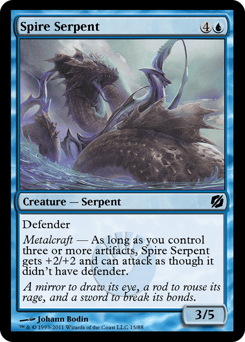 Defender Metalcraft — As long as you control three or more artifacts, Spire Serpent gets +2/+2 and can attack as though it didn't have defender.