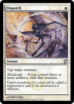 Tap target creature. Metalcraft — If you control three or more artifacts, exile that creature.