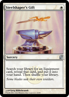 Search your library for an Equipment card, reveal that card, put it into your hand, then shuffle.