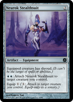 Equipped creature has shroud. (It can't be the target of spells or abilities.) {U}{U}: Attach Neurok Stealthsuit to target creature you control. Equip {1} ({1}: Attach to target creature you control. Equip only as a sorcery.)