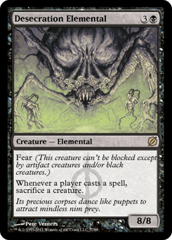 Fear (This creature can't be blocked except by artifact creatures and/or black creatures.) Whenever a player casts a spell, sacrifice a creature.