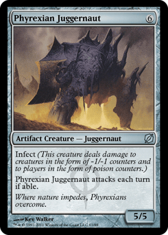 Infect (This creature deals damage to creatures in the form of -1/-1 counters and to players in the form of poison counters.) Phyrexian Juggernaut attacks each combat if able.