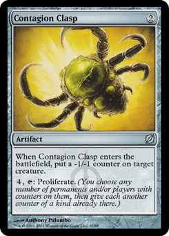 When Contagion Clasp enters, put a -1/-1 counter on target creature. {4}, {T}: Proliferate. (Choose any number of permanents and/or players, then give each another counter of each kind already there.)
