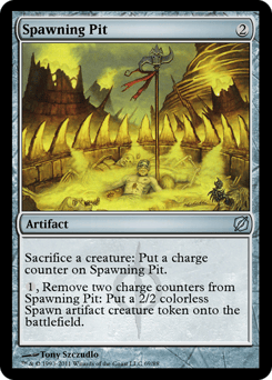 Sacrifice a creature: Put a charge counter on Spawning Pit. {1}, Remove two charge counters from Spawning Pit: Create a 2/2 colorless Spawn artifact creature token.