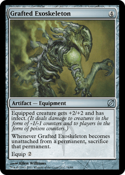 Equipped creature gets +2/+2 and has infect. (It deals damage to creatures in the form of -1/-1 counters and to players in the form of poison counters.) Whenever Grafted Exoskeleton becomes unattached from a permanent, sacrifice that permanent. Equip {2}