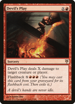 Devil's Play deals X damage to any target. Flashback {X}{R}{R}{R} (You may cast this card from your graveyard for its flashback cost. Then exile it.)