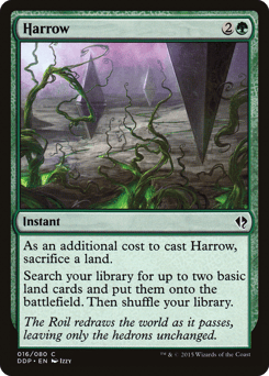 As an additional cost to cast this spell, sacrifice a land. Search your library for up to two basic land cards, put them onto the battlefield, then shuffle.