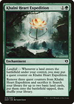 Landfall — Whenever a land you control enters, you may put a quest counter on this enchantment. Remove three quest counters from this enchantment and sacrifice it: Search your library for up to two basic land cards, put them onto the battlefield tapped, then shuffle.