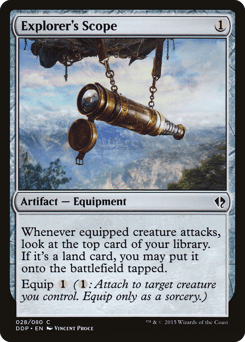 Whenever equipped creature attacks, look at the top card of your library. If it's a land card, you may put it onto the battlefield tapped. Equip {1} ({1}: Attach to target creature you control. Equip only as a sorcery.)