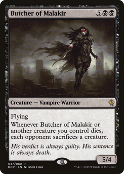 Flying Whenever this creature or another creature you control dies, each opponent sacrifices a creature of their choice.