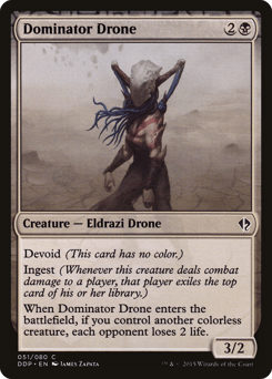Devoid (This card has no color.) Ingest (Whenever this creature deals combat damage to a player, that player exiles the top card of their library.) When this creature enters, if you control another colorless creature, each opponent loses 2 life.