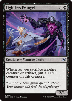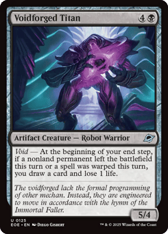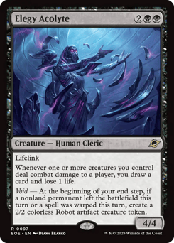 Lifelink Whenever one or more creatures you control deal combat damage to a player, you draw a card and lose 1 life. Void — At the beginning of your end step, if a nonland permanent left the battlefield this turn or a spell was warped this turn, create a 2/2 colorless Robot artifact creature token.