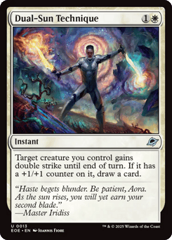 Target creature you control gains double strike until end of turn. If it has a +1/+1 counter on it, draw a card.