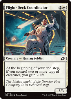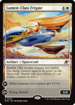 Station (Tap another creature you control: Put charge counters equal to its power on this Spacecraft. Station only as a sorcery. It's an artifact creature at 12+.) Station 2+: Other creatures you control get +1/+1. Station 12+: Flying, lifelink