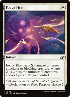 Focus Fire deals X damage to target attacking or blocking creature, where X is 2 plus the number of creatures and/or Spacecraft you control.