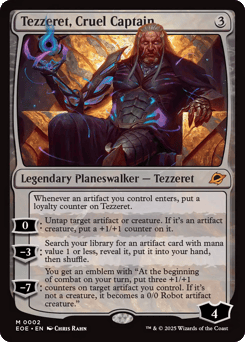Whenever an artifact you control enters, put a loyalty counter on Tezzeret. [0]: Untap target artifact or creature. If it's an artifact creature, put a +1/+1 counter on it. [−3]: Search your library for an artifact card with mana value 1 or less, reveal it, put it into your hand, then shuffle. [−7]: You get an emblem with "At the beginning of combat on your turn, put three +1/+1 counters on target artifact you control. If it's not a creature, it becomes a 0/0 Robot artifact creature."