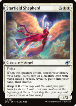 Flying When this creature enters, search your library for a basic Plains card or a creature card with mana value 1 or less, reveal it, put it into your hand, then shuffle. Warp {1}{W} (You may cast this card from your hand for its warp cost. Exile this creature at the beginning of the next end step, then you may cast it from exile on a later turn.)