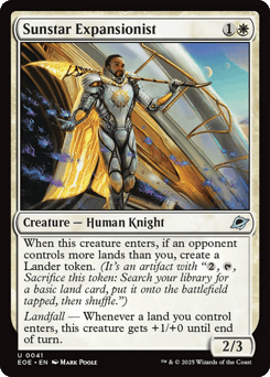 When this creature enters, if an opponent controls more lands than you, create a Lander token. (It's an artifact with "{2}, {T}, Sacrifice this token: Search your library for a basic land card, put it onto the battlefield tapped, then shuffle.") Landfall — Whenever a land you control enters, this creature gets +1/+0 until end of turn.