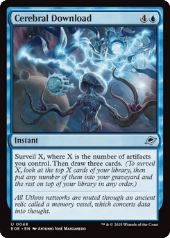 Surveil X, where X is the number of artifacts you control. Then draw three cards. (To surveil X, look at the top X cards of your library, then put any number of them into your graveyard and the rest on top of your library in any order.)