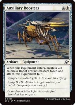 When this Equipment enters, create a 2/2 colorless Robot artifact creature token and attach this Equipment to it. Equipped creature gets +1/+2 and has flying. Equip {3} ({3}: Attach to target creature you control. Equip only as a sorcery.)