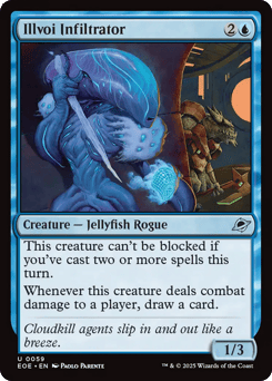 This creature can't be blocked if you've cast two or more spells this turn. Whenever this creature deals combat damage to a player, draw a card.