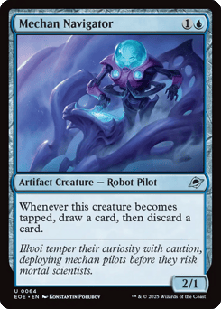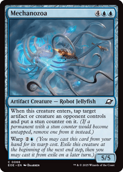 When this creature enters, tap target artifact or creature an opponent controls and put a stun counter on it. (If a permanent with a stun counter would become untapped, remove one from it instead.) Warp {2}{U} (You may cast this card from your hand for its warp cost. Exile this creature at the beginning of the next end step, then you may cast it from exile on a later turn.)