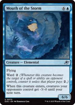 Flying Ward {2} (Whenever this creature becomes the target of a spell or ability an opponent controls, counter it unless that player pays {2}.) When this creature enters, creatures your opponents control get -3/-0 until your next turn.