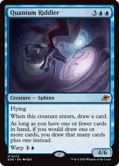 Flying When this creature enters, draw a card. As long as you have one or fewer cards in hand, if you would draw one or more cards, you draw that many cards plus one instead. Warp {1}{U}