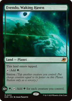 This land enters tapped. {T}: Add {G}. Station (Tap another creature you control: Put charge counters equal to its power on this Planet. Station only as a sorcery.) Station 12+: {G}, {T}: Add {G} for each creature you control.