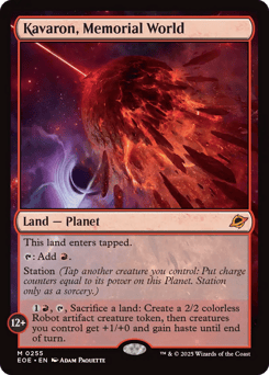 This land enters tapped. {T}: Add {R}. Station (Tap another creature you control: Put charge counters equal to its power on this Planet. Station only as a sorcery.) Station 12+: {1}{R}, {T}, Sacrifice a land: Create a 2/2 colorless Robot artifact creature token, then creatures you control get +1/+0 and gain haste until end of turn.