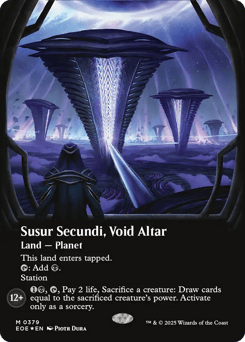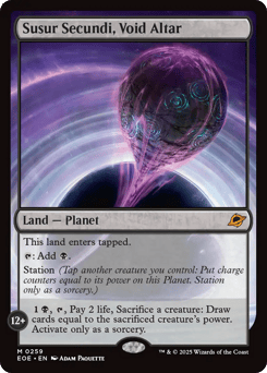 This land enters tapped. {T}: Add {B}. Station (Tap another creature you control: Put charge counters equal to its power on this Planet. Station only as a sorcery.) Station 12+: {1}{B}, {T}, Pay 2 life, Sacrifice a creature: Draw cards equal to the sacrificed creature's power. Activate only as a sorcery.